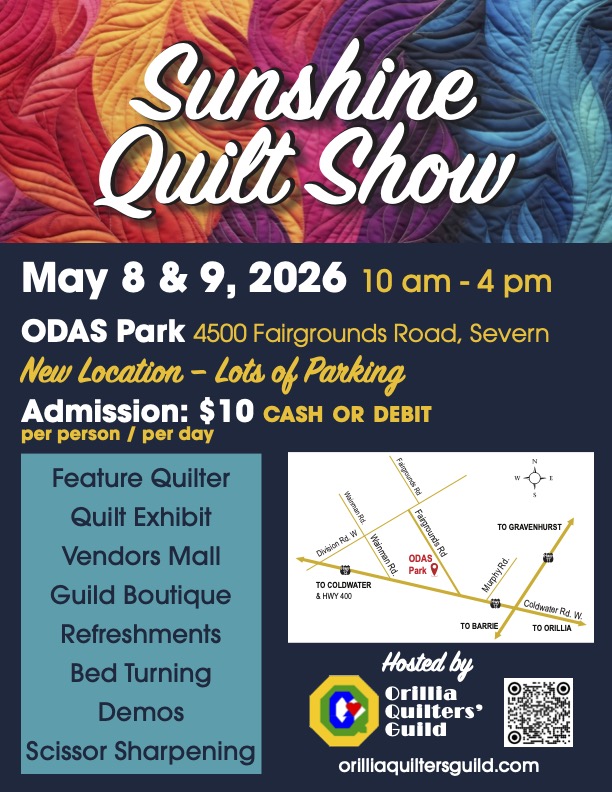 The Orillia Quilters’ Guild is thrilled to announce our upcoming show the Sunshine Quilt Show. This event will be held on May 8 & 9, 2026 at ODAS Park. This new location has plenty of space for our show and lots of parking. It is located just to the west of Orillia at 4500 Fairgrounds Road, Severn.